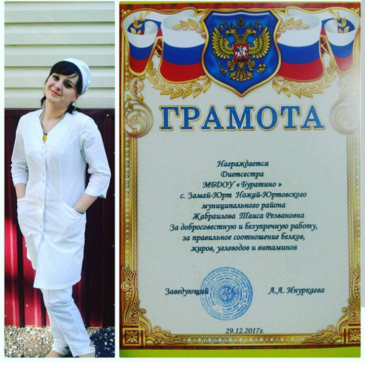 29.12.2017Награждена почетной грамотой от заведующей, Жабраилова Таиса Резвановна, диетсестра МБДОУ "Детский сад "Буратино" с.Замай-Юрт, за добросовестную и безупречную работу, за правильное соотношение белков, жиров, углеводов и витаминов!